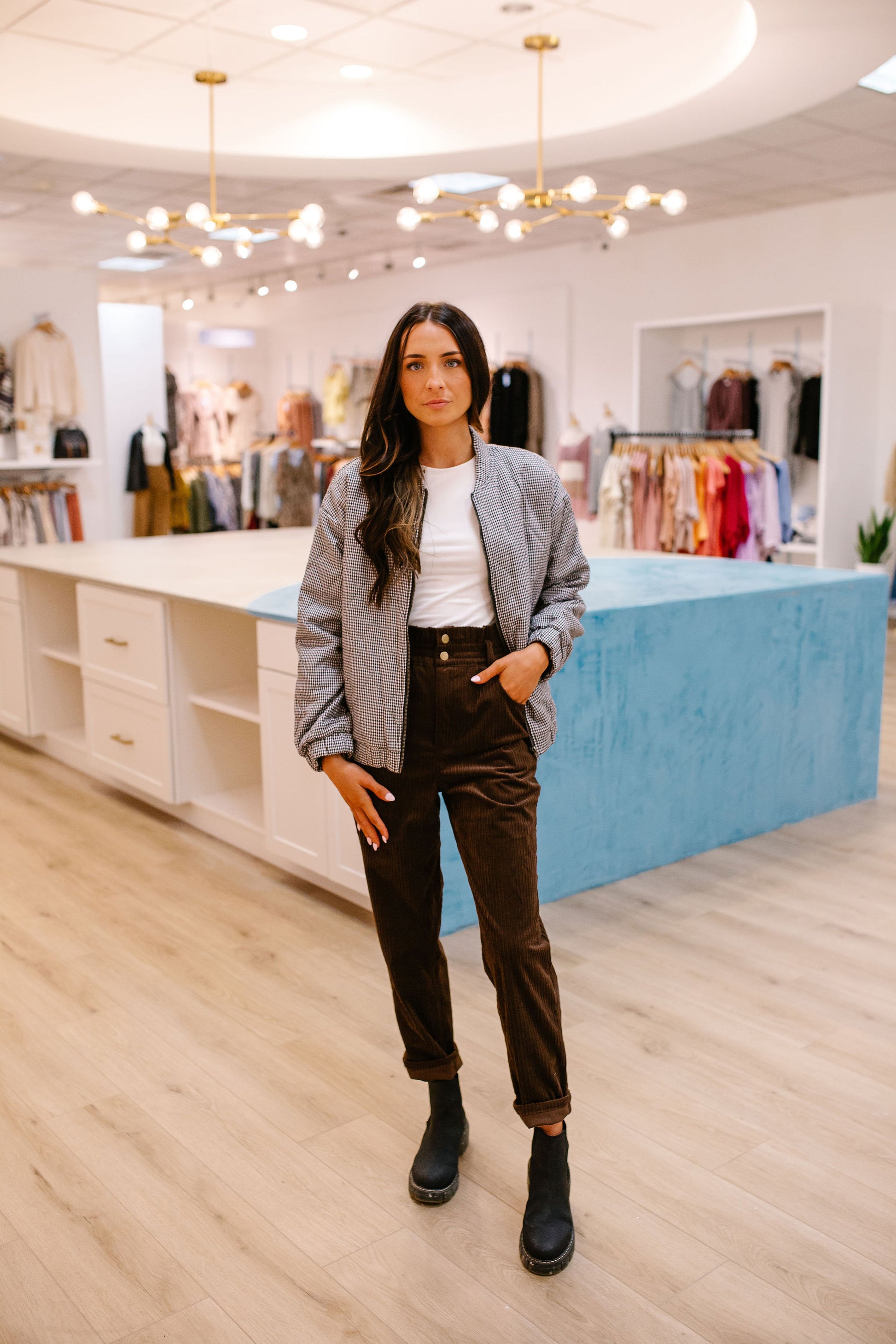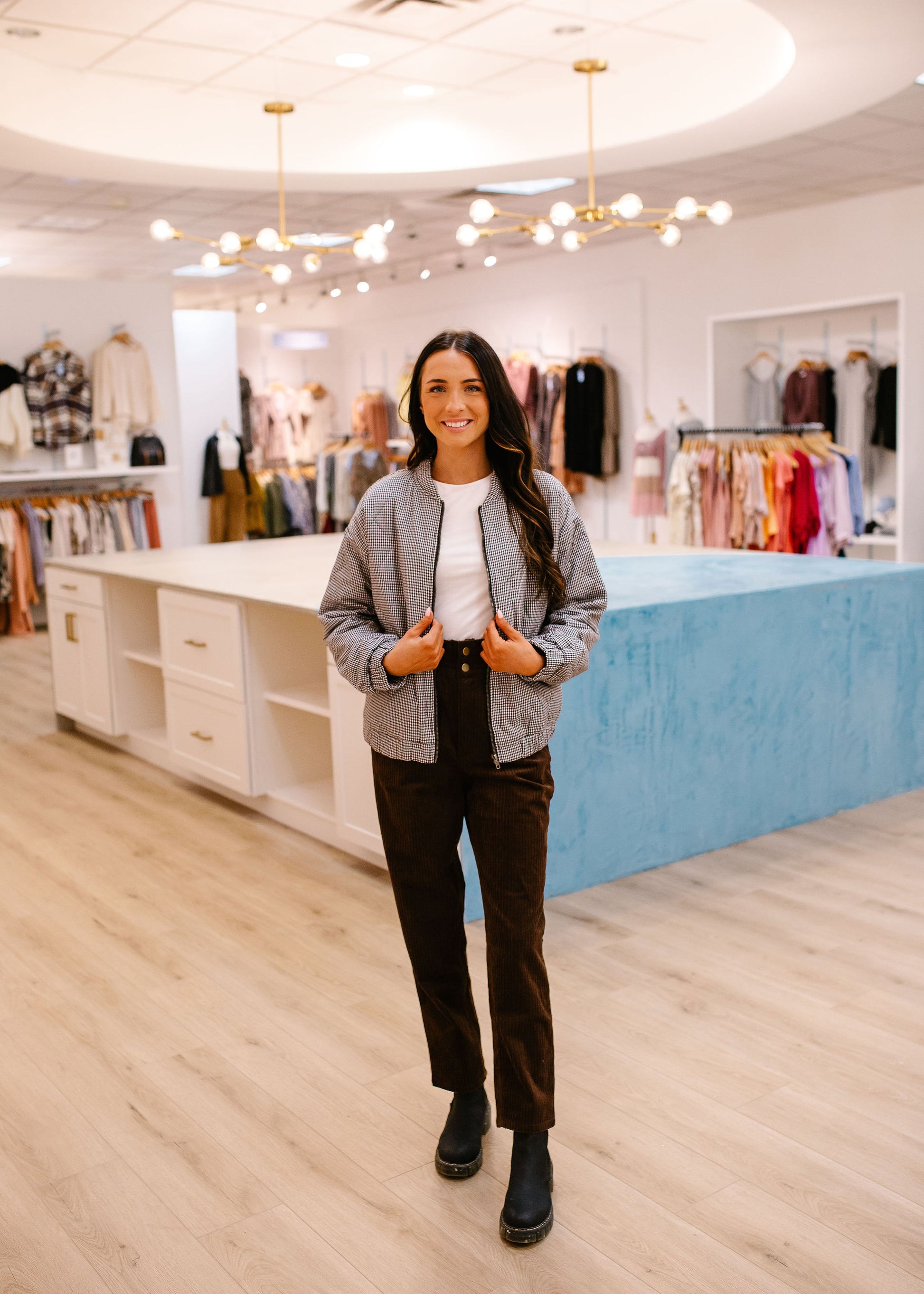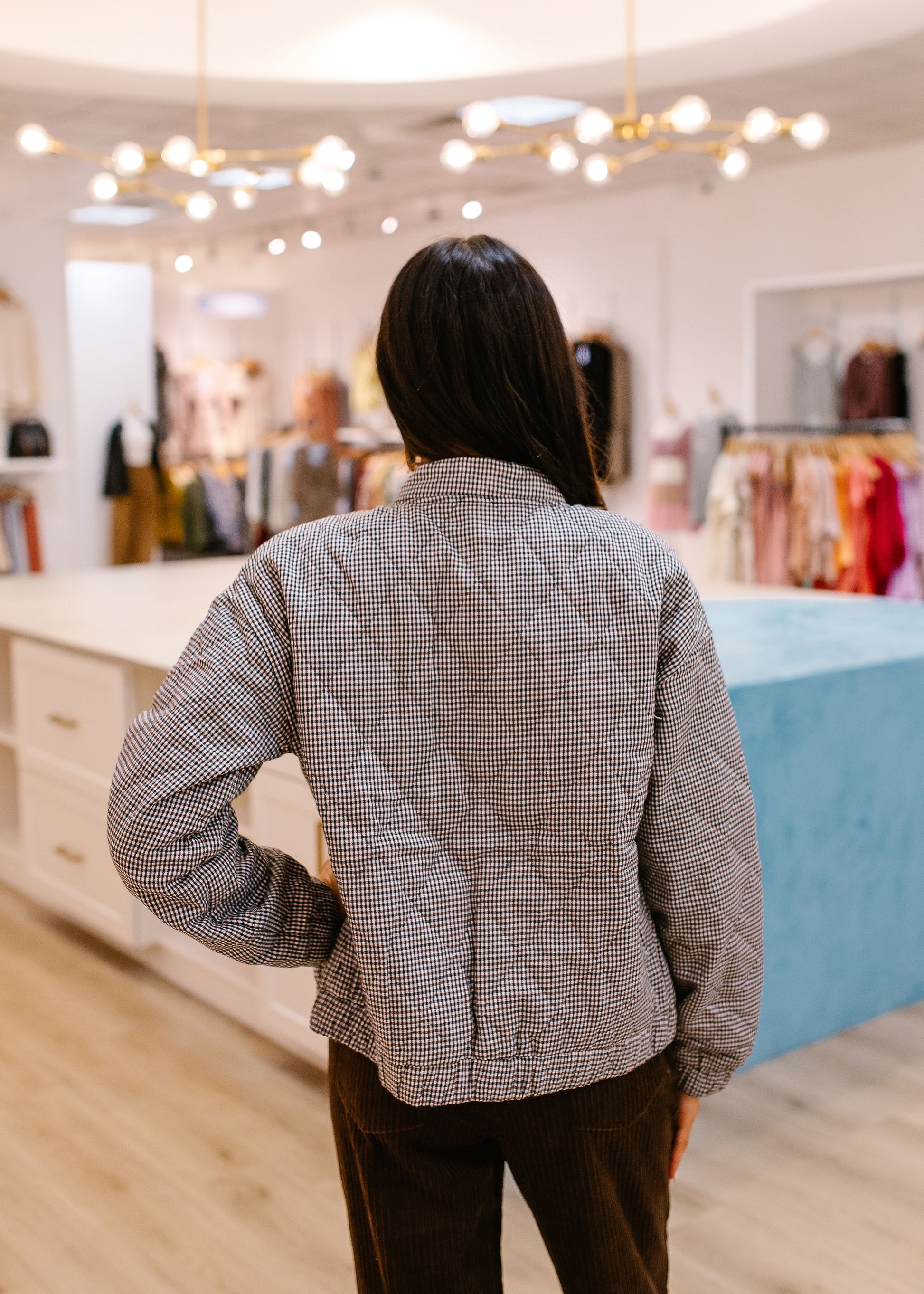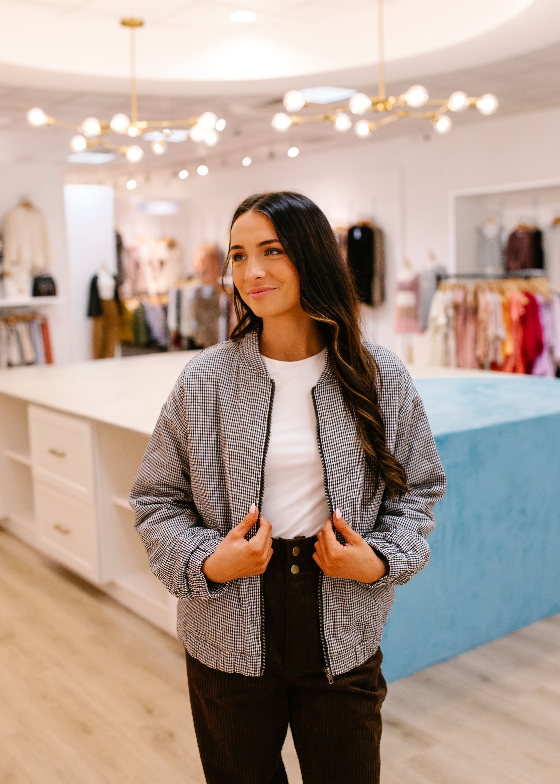 This diamond-quilted, zip-up bomber jacket is the perfect choice to complete your outfit during the cooler months! We suggest wearing with a plain white tee or your favorite graphic tee to complete the look!