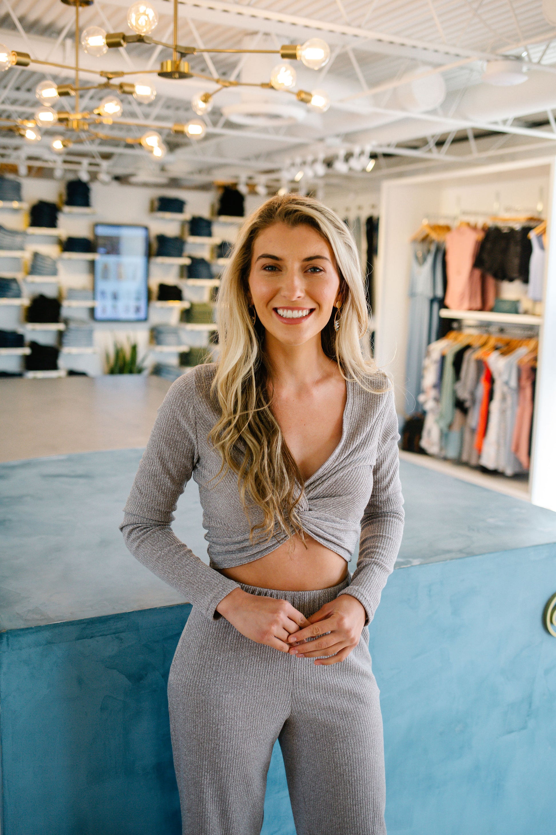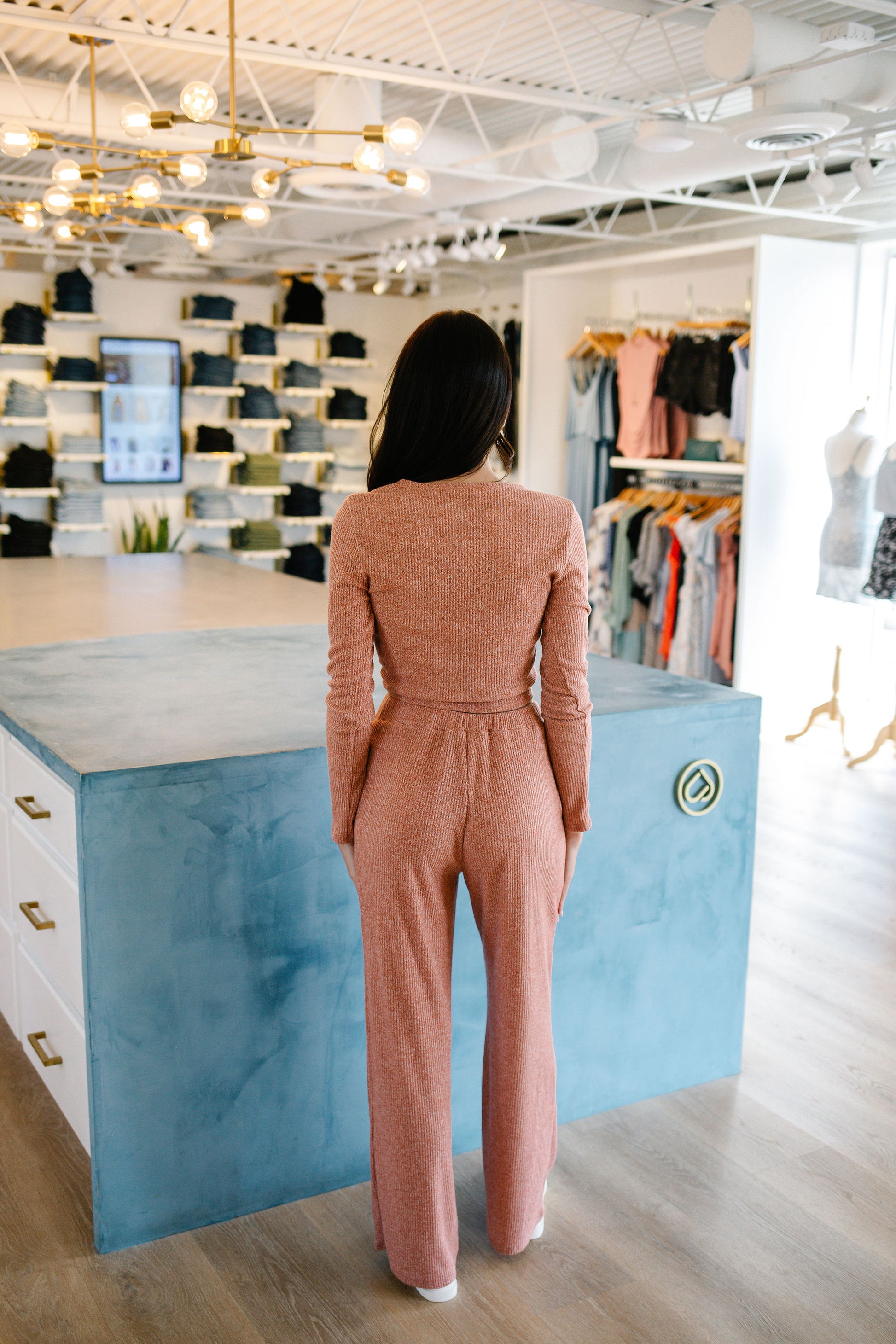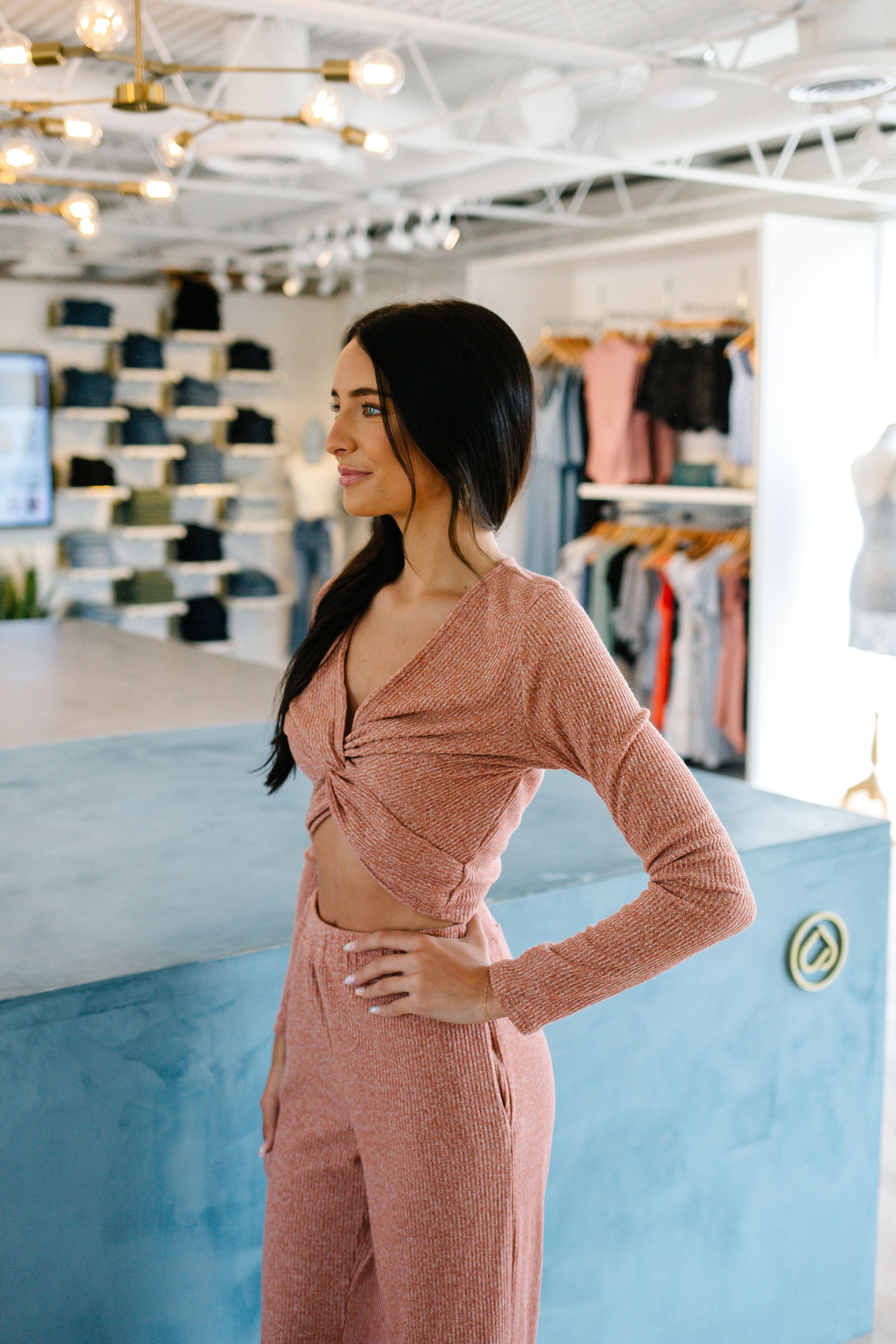 This two-piece lounge set is a CJ's Closet favorite! This ribbed set features a top with a twist, creating a fun and comfy set that is perfect for watching movies and a girl's night in! Pair this set with your favorite slides for a fashion forward look.