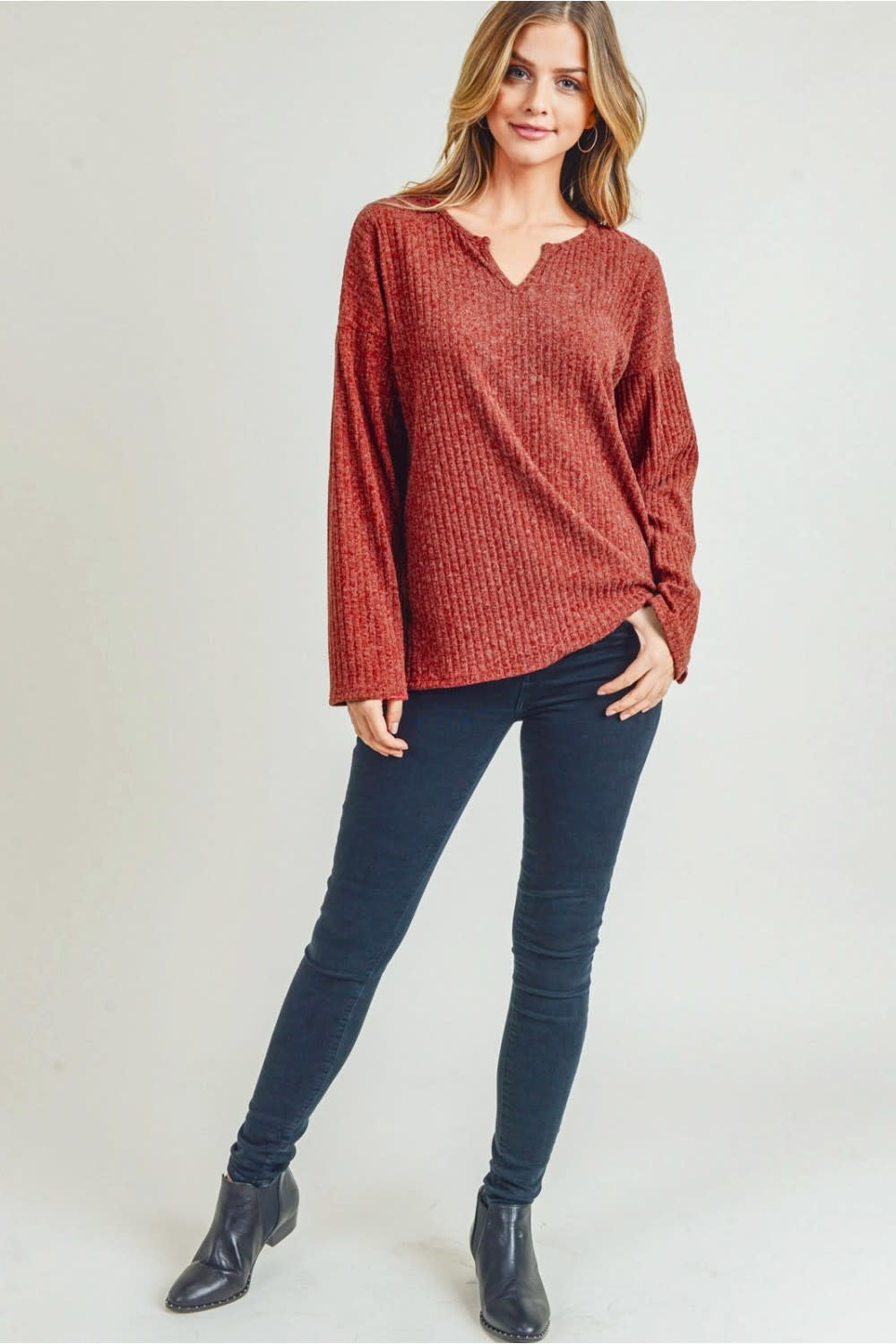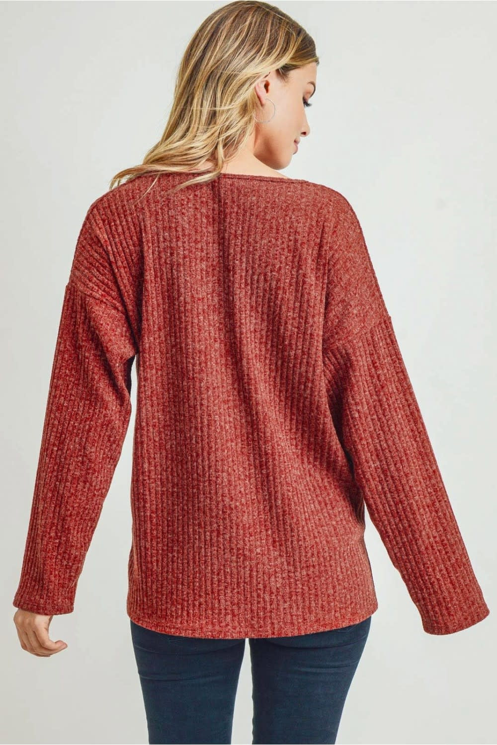 This soft sweater features drop shoulders and notched neckline. Throw this top on with your favorite jeans for an effortlessly cute and casual look!