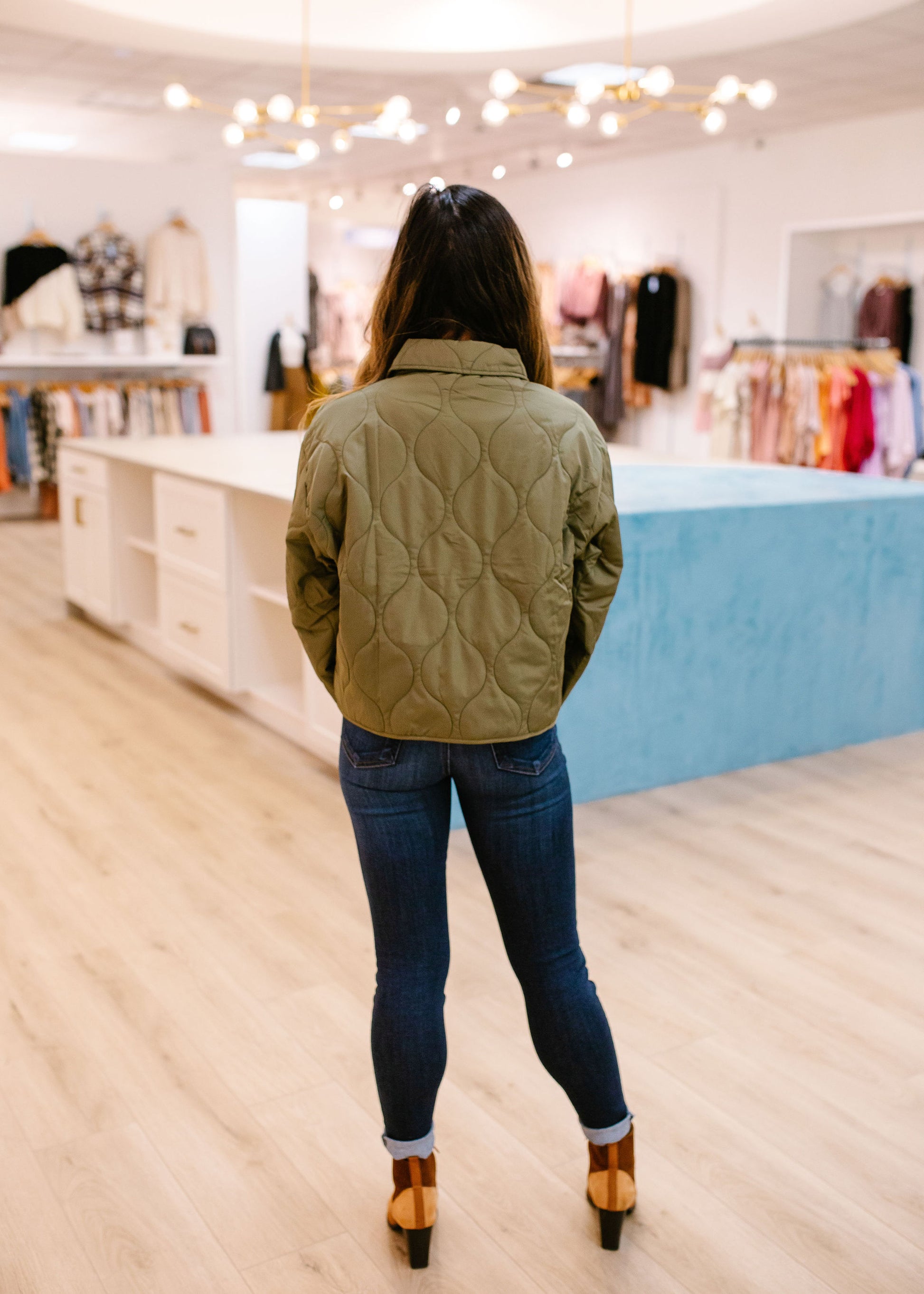 This quilted jacket features a button-up front and two buttoned flap pockets. Easily pair with any of our CJC denim for a completed fall look!